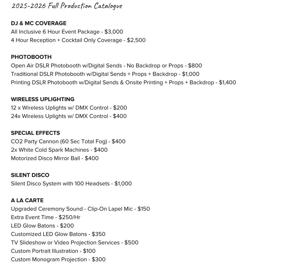Thank you for your inquiry! We would love to work with you for your big day. We believe our services are priced competitively and accurately, and we can't wait to bring that value to your next event. We only use top of the line, industry standard equipment, and leave no room for error.